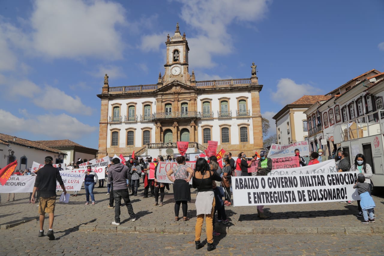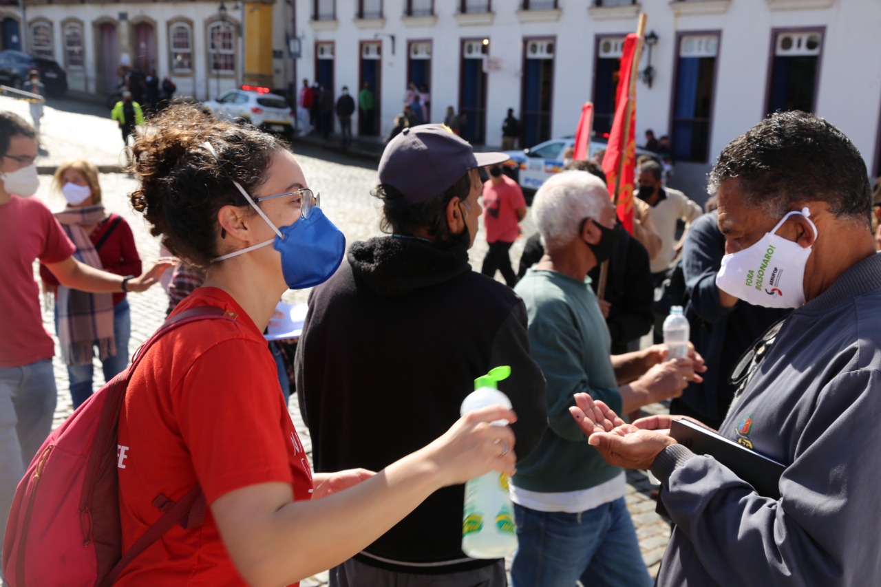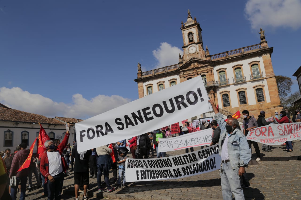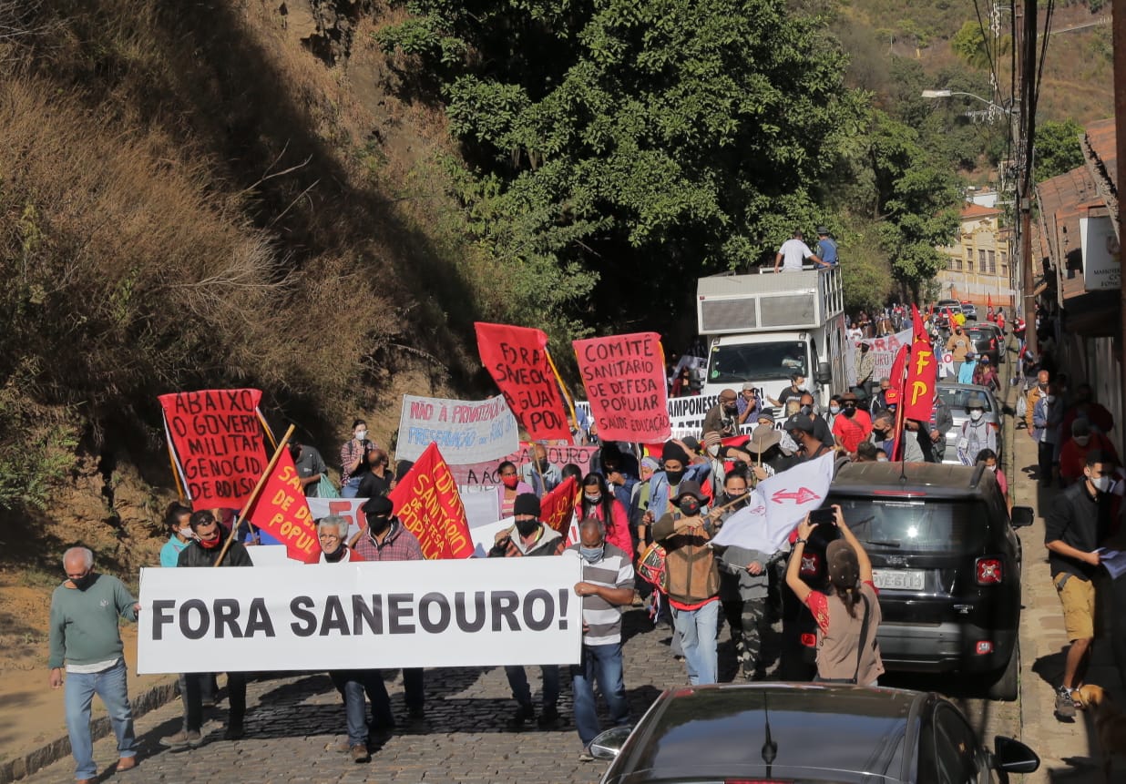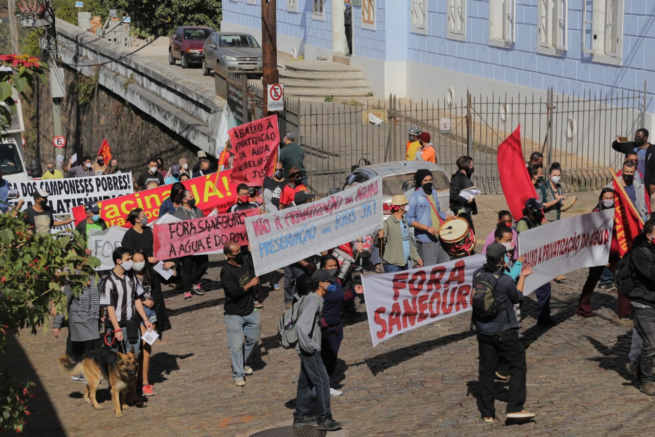 Na manhã desta quinta-feira (8), aniversário de 310 anos da cidade, moradores de Ouro Preto protestaram contra a privatização da água no município. Com faixas, bandeiras e palavras de luta, os moradores reivindicaram o fim da transferência da administração dos serviços de água e esgoto da cidade para a Saneouro, um consórcio de empresas privadas. Antes a distribuição e gestão da água era feita pela autarquia Serviço Municipal de Água e Esgoto de Ouro Preto (Semae-OP). O protesto foi organizado pelo Comitê Sanitário de Defesa Popular e contou com a participação de sindicatos – como o ASSUFOP – associações de bairros, lideranças comunitárias e movimentos sociais. A mobilização saiu da Praça da Estação, seguiu até a Praça Tiradentes e terminou no bairro São Cristóvão. Ao longo do trajeto, os organizadores distribuíram máscaras e álcool em gel aos participantes.