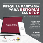 Os Presidentes do Sindicato dos Trabalhadores Técnico Administrativos da Universidade Federal de Ouro Preto (Sindicato ASSUFOP) e da Associação dos Docentes da Universidade Federal de Ouro Preto (ADUFOP – Seção Sindical) e o(a) representante do Diretório Central de Estudantes da UFOP (DCE/UFOP), nos termos do art. 2º, do Regulamento de Pesquisa Paritária, tornam público, para