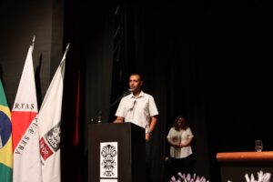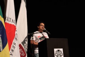 Joana Ferreira do Amaral, cuja fala homenageou Rinaldo Cardoso dos Santos, ressaltou a extrema habilidade que o professor teve para ensinar e criar laços com todos os alunos, TAEs e outros professores da Escola de Nutrição, sendo um grande exemplo da atuação de professores para um ensino de qualidade, gratuito e universal.