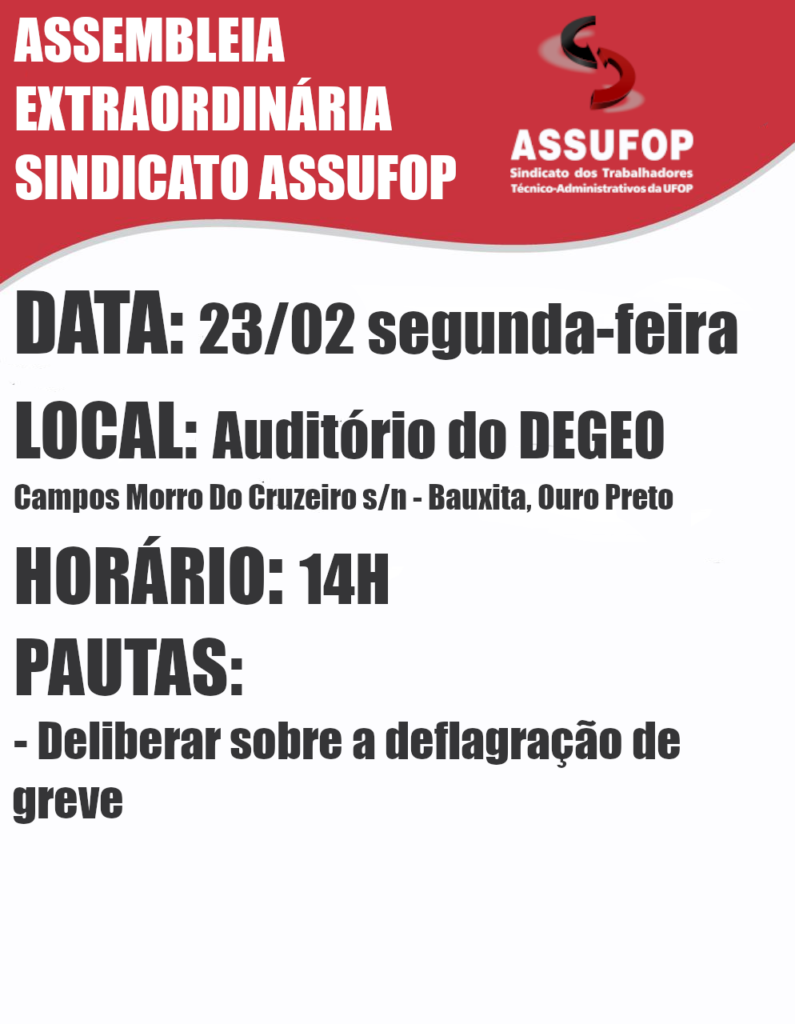 Convocação de assembleia extraordinária. Participe!Por ASSUFOP / 13/02/2026 Receba às noticias do Sindicato ASSUFOP por WhatsAppClique aqui para acessar o canal do WhatsAppReceber notícias do Sindicato ASSUFOP por e-mailAtive o JavaScript no seu navegador para preencher este formulário.Ative o JavaScript no seu navegador para preencher este formulário.Nome Completo * Nome Completo Email EmailEnviar