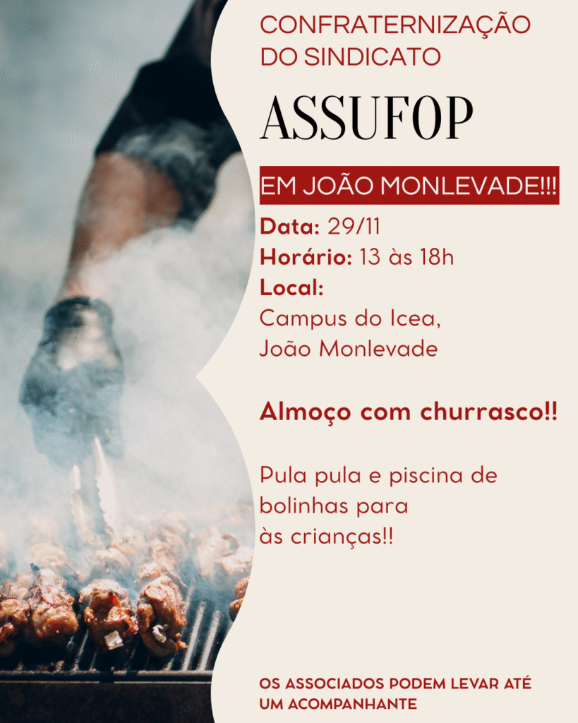 O sindicato ASSUFOP convida todos os associados para a nossa Festa de Confraternização em João Monlevade!