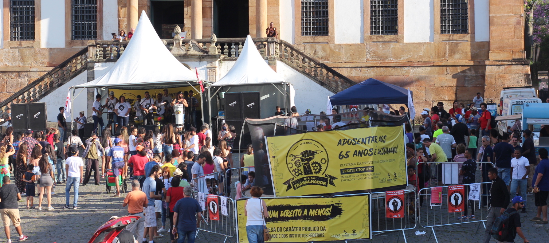 A Frente UFOP IFMG composta pelo SINASEFE IFMG, ASSUFOP e ADUFOP fez nesta quarta (1) um ato político Cultural na Praça Tiradentes, em Ouro Preto, para celebrar o Dia do Trabalhador e lutar contra a Reforma da Previdência e os ataques à educação gratuita, pública e de qualidade. O evento teve início às 15h com a banda Villodum.